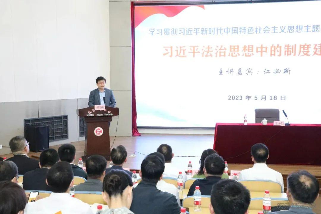 为深入推进我校学习贯彻习近平新时代中国特色社会主义思想主题教育,牢牢把握“学思想、强党性、重实践、建新功”的总要求,深刻领悟习近平新时代中国特色社会主义思想的真理力量和实践伟力,5月18日下午,我校在黄河路校区学术报告厅举办学习贯彻习近平新时代中国特色社会主义思想主题教育专题报告会,邀请全国著名法学家、中国法学会副会长江必新教授到校作专题辅导。本次报告会由我校与大连市法学会、大连市律师协会共同主办。大连市法学会、大连市律师协会代表,我校在连校领导,机关各部处、各二级单位党政负责人及师生代表共计300余人参加会议。徐昭峰副校长主持报告会。