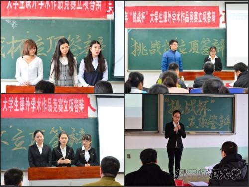 2017年“挑战杯”大学生课外学术作品竞赛立项答辩分别在理化楼C区与外语楼一合教室依据项目类别进行。评审组共分为四类五组:哲学社科组(A.B)、地理化学生科组、物理信息和科技发明组、法学组。