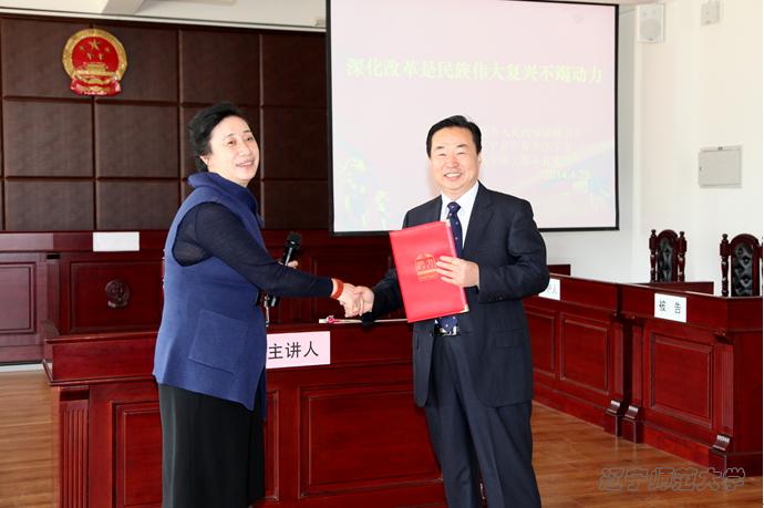 丁慧教授代表法学院宣布聘请都本有校友为法学院名誉教授,并向都本有校友颁发了炸金花在线 法学院名誉教授的聘书。