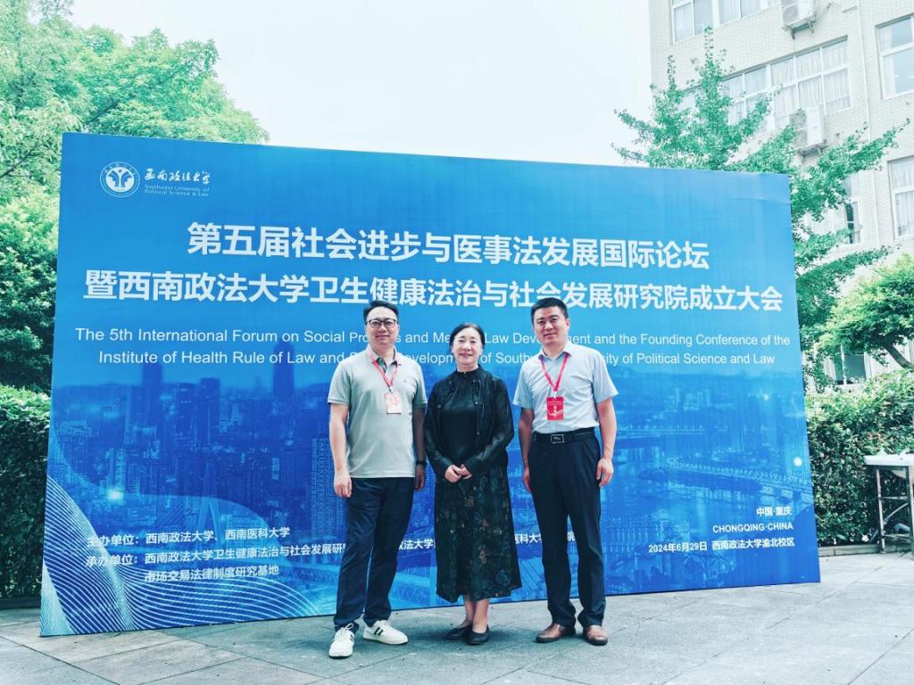 6月29日,第五届社会进步与医事法发展国际论坛暨西南政法大学卫生健康法治与社会发展研究院成立大会,在西南政法大学(渝北校区)隆重举行。国家卫生健康委员会法规司副司长龚向光,西南政法大学党委书记樊伟,西南医科大学党委副书记、校长张春祥,中国卫生法学会常务副会长沙玉申,重庆市高级人民法院审判委员会专职委员贾科等领导出席并致辞。西南政法大学党委常委、副校长李燕主持论坛。我校炸金花在线 院长,博士生导师陈光教授,法学一级学科带头人丁慧教授,炸金花在线 副院长刘耀东副教授受邀出席了本次论坛。